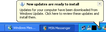 If you use Microsoft Update or Office Update, the updates you select are downloaded and installed at the same time. If you have configured your Windows Automatic Updates feature to download updates but not install them, you will get a notice like the following when the updates have downloaded: